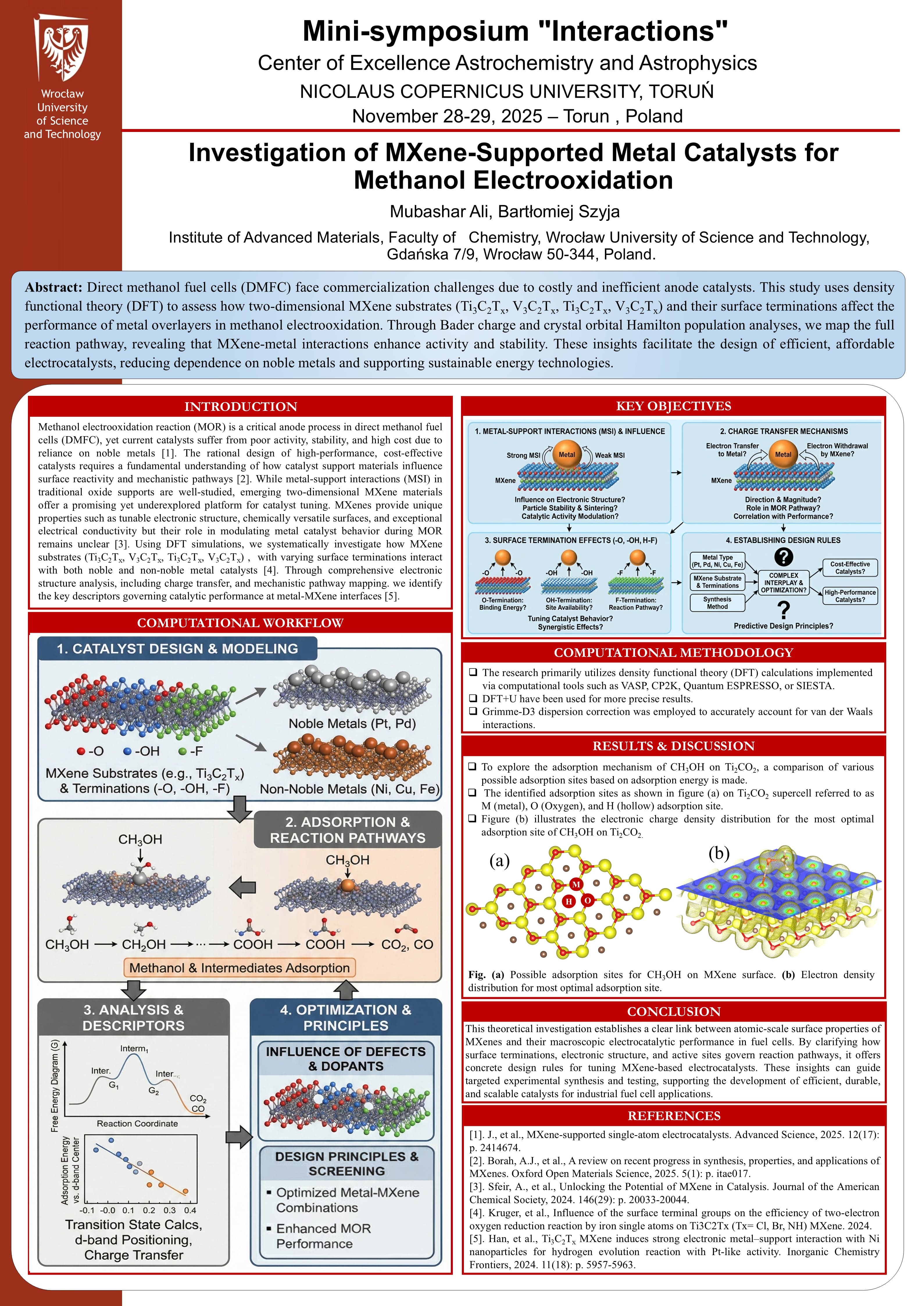 He participated in the Mini-Symposium “Interactions”, organized by the Center of Excellence in Astrochemistry and Astrophysics at Nicolaus Copernicus University, Toruń, Poland. He presented a poster entitled “Investigation of MXene-Supported Metal Catalysts for Methanol Electrooxidation,” showcasing computational insights into MXene-based electrocatalysts for energy-related applications. 🔗 Symposium website
